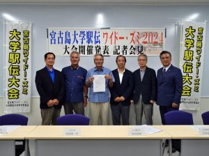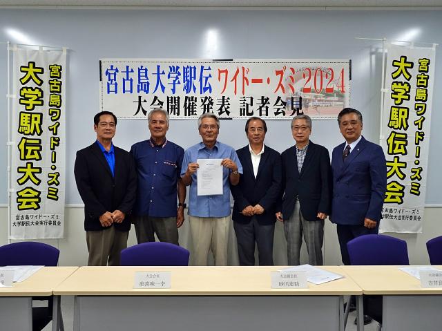 宮古島大学駅伝実行委員会と大会役員らは11日、市役所で会見を開き来年2月11日に市陸上競技場をスタート、ゴールとする100・5㌔(5区間)のコースで「宮古島大学駅伝ワイドー・ズミ2024」を開催することを発表した。大学駅伝の新チームが動き出す大会と広く認知され、宮古島を代表する一大イベントとして成長させることに意欲を示した。