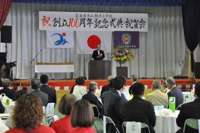 祝辞で座喜味市長は「創立100周年という節目に、学校、家庭、地域がより一体となり学校教育活動の一層の充実と新たな歴史と伝統、校風を築く機会となることを期待する」とあいさつした。