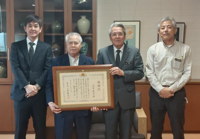 長年、更生保護活動に貢献したとして宮古保護区協力雇用主会長でやまと商事社長の宮里敏男さん(81)が法務大臣感謝状を受賞した。宮里さんは20日、市役所に座喜味一幸市長を訪ね、受賞を報告した。