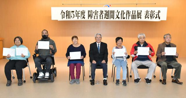 障害者週間文化作品展の表彰式が21日、市役所で開催された。5部門の最優秀賞、優秀賞に選ばれた計11の団体、個人に座喜味一幸市長が表彰状を贈呈した。受賞者らは晴れやかな表情を見せ、今後の創作活動に意欲を示した。入賞作品は作品展を鑑賞した市民が投票で決めた。