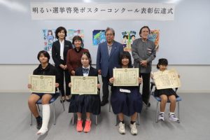 明るい選挙啓発ポスターコンクールの表彰伝達式(主催・市明るい選挙推進協議会、市選挙管理委員会)が22日、市役所で行われた。最高賞の文部科学大臣・総務大臣賞を受賞した平良第一小学校2年の安里笑実(えみ)さんや佳作入賞者らが参加し、同協議会の前川尚誼会長から表彰状の伝達を受けた。
