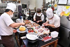 市内のケーキ店では、クリスマスパーティーには欠かせないケーキ作りがピークを迎え、スタッフ総掛かりで作業に追われていた。
