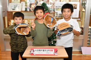 所属チームで投手を務める田名礼虎(らいが)君(3年)は「大谷選手が大好き。グローブはいい感触だった。軽くて使いやすそう。練習で使ってみたい」と満面の笑みで話した。