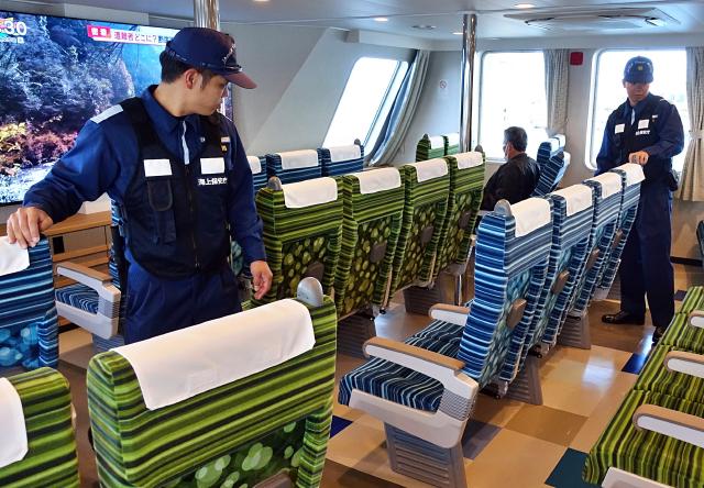 宮古島海上保安部(福本拓也部長)は26日、平良港で多良間島と宮古島を結ぶ「フェリーたらまⅢ」で年末年始特別警戒および安全指導を実施した。同保安部の職員4人が同船に乗船し、宮古-多良間往復の船内で多客繁忙時期における安全確保などを呼び掛けた。