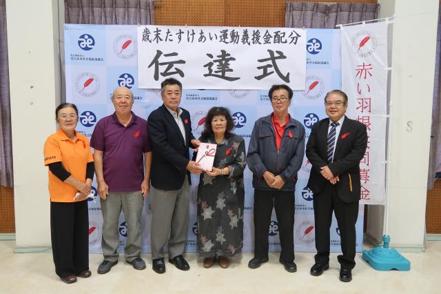 「歳末たすけあい義援金」の伝達式が27日、平良老人福祉センターで行われ、市社会福祉協議会の野原勝会長から市民生委員児童委員協議会の砂川美枝子会長に目録が手渡された。