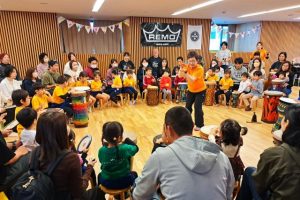 輪になって打楽器を演奏するドラムサークルのファシリテーター(案内人)研修所「VMCグローバルジャパン」は8日、はなぞのこどもえんでドラムサークルを実施した。「リズムでつながろう!」をテーマに同研究所代表理事の横田友子さんらがリズムファシリテーターを務め、参加者した園児や保護者たちに、打楽器のたたくスピードを上げさせたり、強弱をつけたりして演奏で一体感を高めさせた。