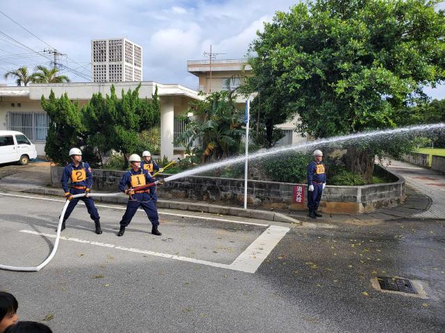 【多良間】多良間村消防団(羽地健団長)は9日、新春恒例の出初め式を村コミュニティー施設で行った。一斉放水を行い1年間の無災害を願った。今年二十歳を迎えた大城菜美さんが一日消防団長を務めた。