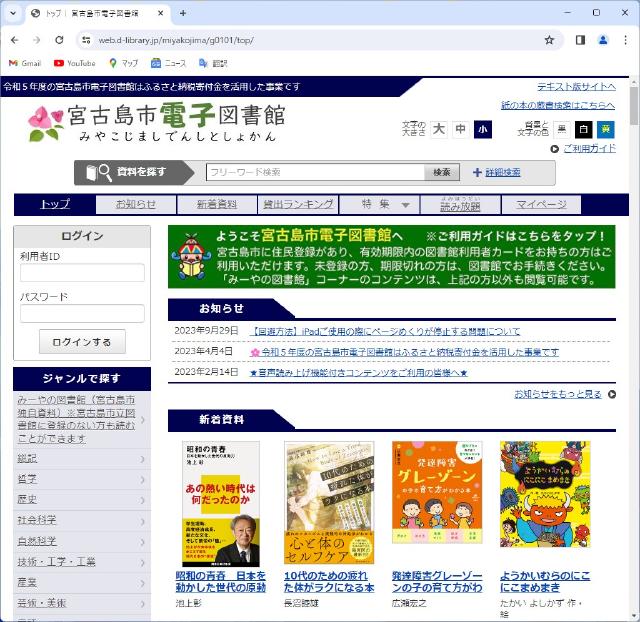 利用は電子図書館のアドレス(https://web.d‐library.jp/miyakojima/)まで。