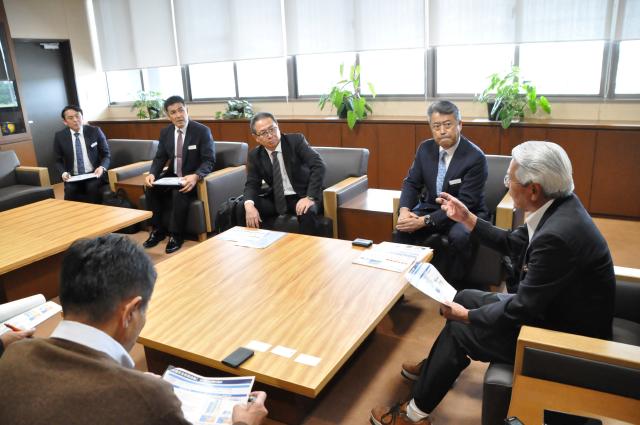 沖縄トヨタ自動車・トヨタレンタリース沖縄の野原朝昌社長らが11日、市役所に座喜味一幸市長を訪ね、市内で行うデマンド型乗り合いバスの実証事業「チョイソコみやこじま友利線」など4事業について報告。交通課題解決、防災対策、カーボンニュートラルの推進に関する市と沖縄トヨタグループとの包括協定の締結について提案した。野原社長は「SDGsや防災、観光、市民の足などの課題を網羅した協定について前向きに考えたい」と述べた。