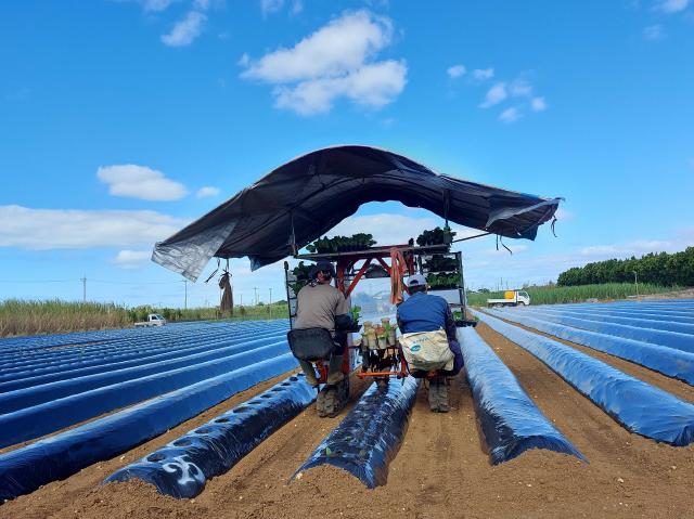 葉タバコの苗を育苗ハウスから本畑に植え付ける作業が市内の一部地域で始まっている。城辺地区の畑では12日、生産農家が管理作業車に乗って作業する姿が見られた。県たばこ耕作組合によると市内の生産農家戸数は64戸、栽培面積は248・4㌶。多良間村は7戸、14・7㌶。