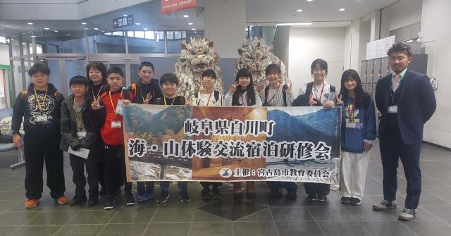 宮古島市の交流都市である岐阜県白川町を訪れ、地域の人たちと交流を深めながらスキーなどを体験する「海・山体験交流宿泊研修会」の出発式が12日、宮古空港で開かれた。下地小学校6年生10人が3泊4日の日程で白川町を訪れる。出発式で児童代表は「雪が楽しみ」などと抱負を語った。新型コロナの影響で休止していたが、今回は4年ぶり。