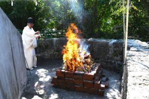正月飾りなどを燃やして向こう1年の健康を願う「どんど焼き」が15日、宮古神社で行われた。権禰宜(ごんねぎ)の奧間寛次さんがお守りやお札などに火をつけて「御焚き上げ(おたきあげ)」を行い、1年間守ってくれたことに感謝して煙が昇天するのを見守った。