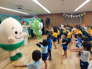 国土緑化推進機構と県緑化推進委員会は17日、はなぞのこどもえん(新城久恵園長)で、森の役割について学ぶ「森の教室」を開いた。3歳から5歳の園児約80人がクイズやキャラクターショーを通して森の大切さを学んだ。