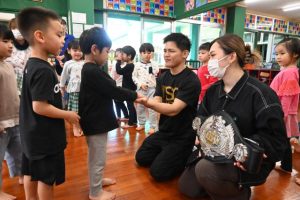 カンガルー保育園(下地諒子園長)は18日、プロボクシングの日本ライトフライ級新王者、川満俊輝さんを招きチャンピオンベルトのお披露目会を行った。間近で見る迫力のあるパンチや本物のチャンピオンベルトを見た園児たちは目を輝かせ歓声を上げていた。