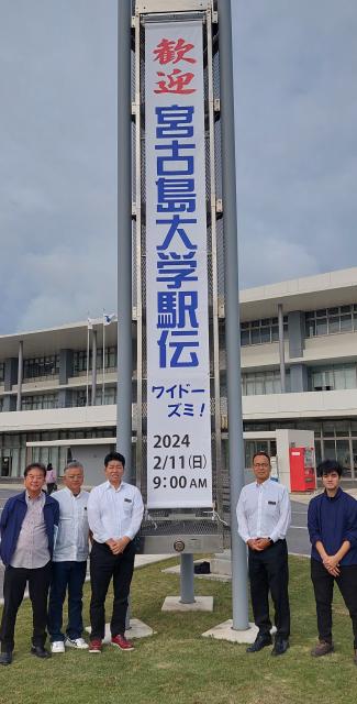 2月11日に開催される「宮古島大学駅伝ワイドー・ズミ2024」(主催・同実行委員会)を盛り上げようと19日、市役所に懸垂幕が掲げられた。11校13チームが出場する今年の大会は、箱根駅伝3位の城西大をはじめ、4位の東洋大、5位の國學院大など来年のシード権を獲得した強豪校がずらり。今年の三大駅伝の展開を占う熱いレースが宮古島で繰り広げられる。