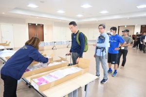 きょう21日に行われる「第34回宮古島100キロワイドーマラソン」(主催・宮古島市ほか)の選手受け付けが20日、市役所であった。受け付け開始時間前から続々と参加者らが訪れ、午後2時の開始と同時に係員からゼッケンなどの備品を受け取っていた。100キロには369人、50キロには162人が出場予定。