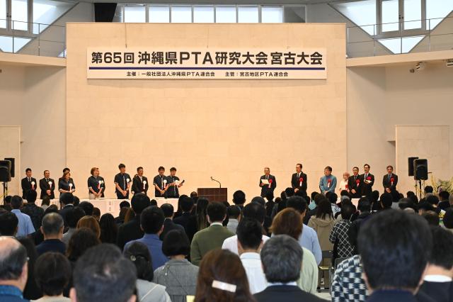 第65回県PTA研究大会宮古大会は21日、JTAドーム宮古島で全体会が開かれた。県内から会員ら約700人が一堂に会し、中学生の意見発表や記念講演、表彰式が行われた。「意義ある活動にするため、SDGsの理念の基、持続可能な家庭教育、学校教育、社会教育を推進する」などとした大会宣言を採択。「家庭教育力の向上」「会員の資質向上」など5項目を決議し2日間の日程を終了した。