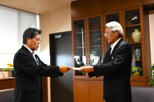 佐良浜地区地域振興協議会(佐久本洋介会長)ら3団体は23日、市役所を訪れ同地区は道幅の狭い道路が多いことから、街づくり基本骨格の背骨となる集落中心部を通り災害、緊急時における円滑な移動経路となる幹線道路の整備を要請した。要請を受けた座喜味一幸市長は「佐良浜地区における道路整備は急ぐべき課題。緊急性が必要だと認識している」と理解を示した。