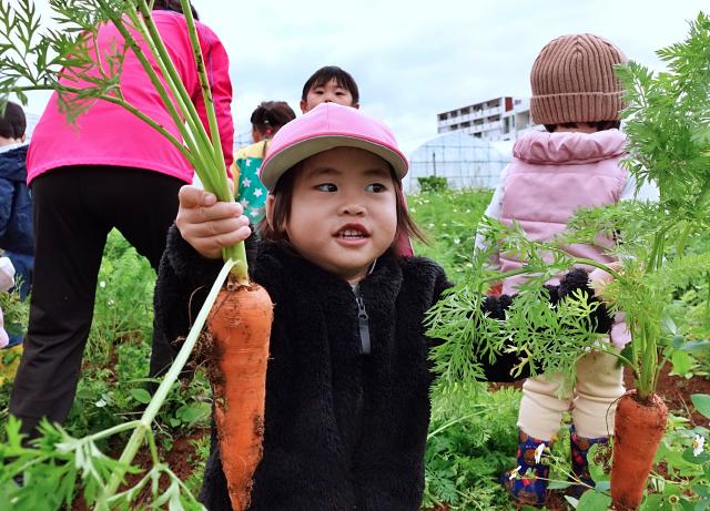 まつばら保育園(粟國香織園長)の1、2歳の園児12人は24日、同園近くの「国仲さん家の農園」(國仲博道代表)でニンジンの収穫体験を行った。ニンジンを畑から引き抜いた園児たちからは「みてみてきれいなニンジン」「大きいの取れたー」などの感想が聞かれた。