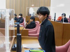 傍聴席には村議や学校関係者らが見守り、保護者も役場ロビーに設置されたモニターで傍聴した。生徒たちは村営体育館の設置や木の実を使った商品開発、人材育成支援、動物病院の建設などについて質問。村当局も丁寧に回答した。