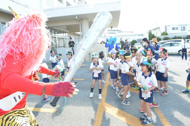 宮古島警察署(喜屋武一郎署長)、宮古島地区交通安全協会(友利勝一会長)は節分前日の2日、同署で「飲酒運転根絶祈願豆まき作戦」を実施した。南幼稚園の園児36人が参加し、飲酒運転する鬼、飛び出しする鬼を豆まきで退治し、季節の伝統行事を通して交通安全や交通事故防止への願いを新たにした。