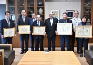 「おきなわ花と食のフェスティバル2024」で県農林漁業賞などを獲得した受賞者らが6日、市役所に座喜味一幸市長を訪ね、受賞の喜びを報告した。県農林漁業賞に2人、野菜品評会金賞に4人が宮古島から選ばれた。受賞者たちは後継者を育成することなどを誓った。