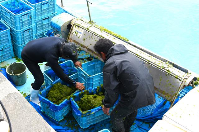 平良の大浦湾で養殖されている海藻の「ヒトエグサ」(宮古方言・アーサ)の収穫が6日、始まった。大浦漁港では宮古島漁協アーサ生産部会(松原幸夫会長)の会員が収穫したアーサがトラックに積み込まれた。今年は昨年に比べてアーサの成長が伸びず、約1週間遅れてのスタートとなった。この日は、漁船2隻が収穫を行い約500キロを水揚げした。