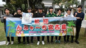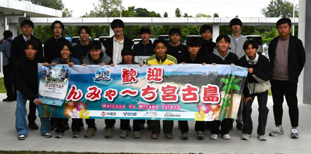 「宮古島大学駅伝ワイドー・ズミ2024」が11日に市陸上競技場発着で開催される。大会に出場する芝浦工業大の選手ら8人が7日、順天堂大学、専修大学の2校の選手、スタッフの計22人が8日、下地島空港に到着した。同大会実行委員会の本村邦彦実行委員長らが横断幕で歓迎した。