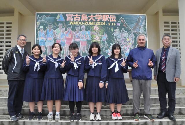 西辺中学校(友利和広校長)黒板アート同好会の2年生5人は8日、「宮古島大学駅伝ワイドー・ズミ2024」(11日、市陸上競技場発着)の応援黒板アートを同実行委員会に寄贈した。生徒代表で與那覇春南さんが「選手たちに頑張ってほしいという気持ち、宮古で走ってくれるといううれしさを込めて描いた。各大学の皆さんに頑張ってほしい」と語った。