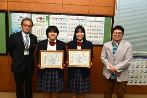 第25回県水産系高校生徒意見・体験発表大会が1月25日、沖縄水産高校で行われ、「私の思い」と題し発表した宮古総合実業高校食と環境科フードクリエイトコースの根間桜さん(2年)が最優秀賞に選ばれた。9日、同校で報告会が行われ、根間さんと優秀賞の根間夢叶さん(同)が喜びを話した。