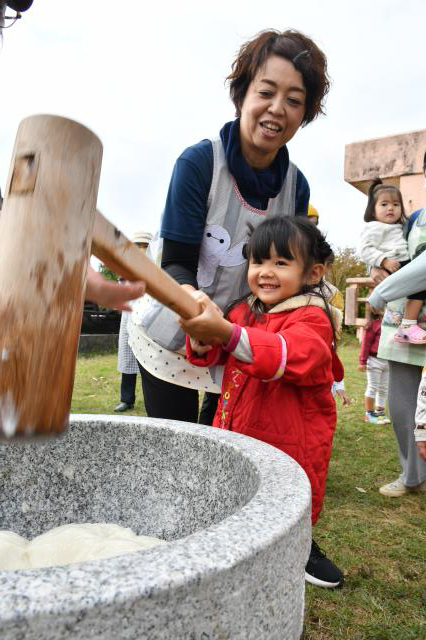下地児童館母親クラブ(藤原菜穂美会長)は10日、同館で餅つきとゆし豆腐作りを行った。園児や児童ら約30人が参加し、「よいしょ、よいしょ」と声を上げながら楽しそうに餅をついた。