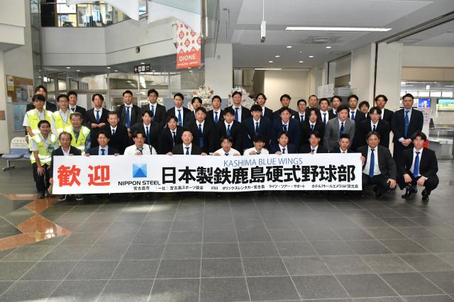 社会人野球の日本製鉄鹿島硬式野球部が15日、春季キャンプのため来島した。宮古島市出身の池間誉人選手をはじめ、総勢39人が宮古入り。市民球場で25日までトレーニングを行う。