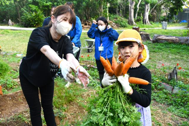 県立宮古青少年の家(島尻政俊所長)は16日、てぃだの子保育園(友利早苗園長)を招いて親子による野菜収穫「パリンカイズー(畑に行こう)」を実施した。収穫した野菜で親たちがカレーを調理。園児たちは自分たちで収穫した野菜を笑顔で食べていた。