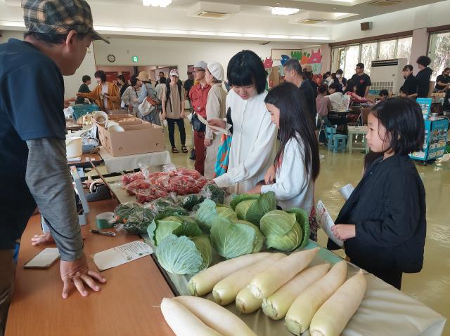 地産地消を促進しようと上野公民館で18日、生産した農家が野菜を直接販売する「しまさんマルシェ」が開かれた。初めての取り組みで、多くの市民が新鮮野菜を求めて詰め掛け盛況だった。市産業振興局が生産者と消費者をつなごうと企画した。水産物や島内産食材を使った弁当も販売された。