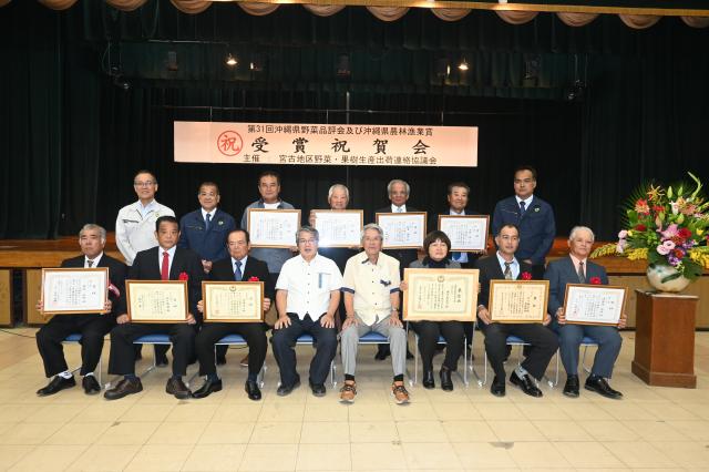 第31回県野菜品評会および県農林漁業賞受賞祝賀会(主催・JAおきなわ宮古地区野菜・果樹生産出荷連絡協議会)が20日、JAおきなわ宮古地区本部大ホールで開催された。会場には受賞者をはじめ座喜味一幸市長、県宮古農林水産振興センターの砂川喜信所長ら来賓や生産農家が詰め掛け、受賞者を祝うとともに宮古島産野菜の品質向上に向け、さらなる努力を誓い合った。