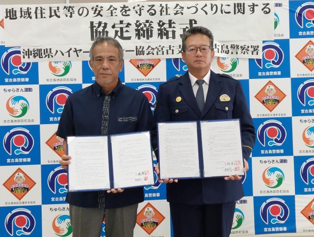 下地支部長は「宮古島の防犯の一助になればと思っているが、協定はタクシー乗務員を守るためでもある。先月、県外でタクシー強盗によって乗務員が亡くなっている。宮古島でもそれに近いことがある。われわれ乗務員も防犯意識をしっかり持って、宮古島の安全安心、日本一安全な島と言われるように活動していきたい」と話した。
