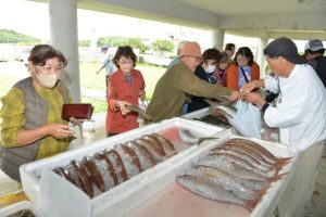 池間漁業協同組合(與那嶺大組合長)主催の「朝市」が23日、池間漁港内池間食堂広場で行われた。多くの市民が来場し、目当ての商品を買い求めていた。鮮魚は特に人気で飛ぶように売れていた。