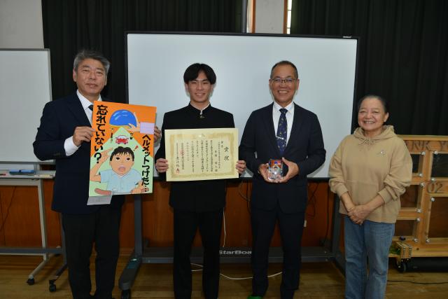 2023年度JA共催全国小・中学生書道・交通安全ポスターコンクールの表彰伝達式が29日、西辺中学校で行われ、交通安全ポスターの部金賞のJA共催連会長賞を受賞した同校の赤嶺煌人さん(3年)にJAおきなわ宮古地区本部の下地誠本部長から賞状と盾が贈られた。赤嶺さんは自転車乗車時のヘルメット着用を訴える作品を描いた。