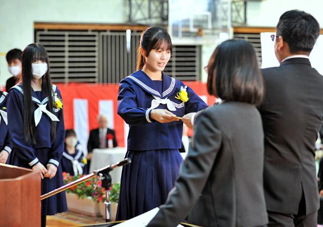 送辞で生徒会長の浜川紫晏さんは「進学先や就職先、新しい生活で不安になることもあると思う。だけど自信を持ってほしい。こんなにたくましく、かっこいい先輩方に出来ないことはないと一番近くで見てきた私たちは確信している。最上級生として私たちを導いてくれてありがとうございました」と感謝を述べた。