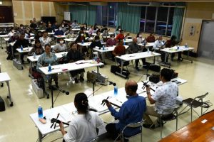 宮古民謡協会(渡久山吉彦会長)は荷川取公民館で演奏会を開いた。同協会の会員ら約70人が参加して「豊年の歌」など11曲を演奏。三線と太鼓、笛の音、歌声が一体となり、会場を包んだ。