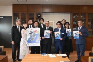10日にマティダ市民劇場で開かれる劇団四季ファミリーミュージカル宮古島公演「ジョン万次郎の夢」のキャストら関係者が8日、市役所に座喜味一幸市長を訪ね公演をPRするとともに、主催する宮古島商工会議所青年部の佐久川力也会長が座喜味市長と大城裕子教育長に招待券を手渡した。