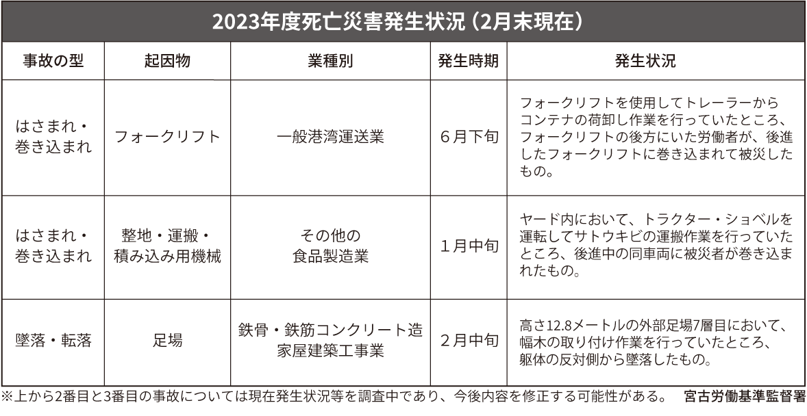 今年度中に発生した大きな産業事故は昨年6月に一般港湾運送業の男性がフォークリフトに巻き込まれ死亡した。また、今年1月にはサトウキビの運搬作業を行っていたブルドーザーに巻き込まれ、男性が死亡している。2月には宿泊施設建設現場の外部足場から男性が転落し死亡した。