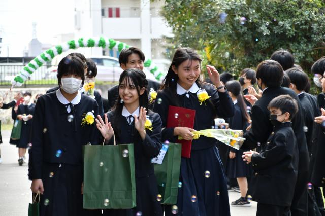 宮國校長は「この3年間で皆さんは青春の輝く時期を経験し、友情を深め、多くの挑戦に立ち向かい、大きく成長した。培ってきた力を土台にさらなる成長を期待する。自分自身の可能性を最大限に引き出し、笑顔と挑戦を忘れずに励んでほしい」と式辞を述べた。