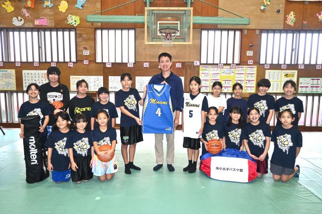 訪問看護ステーションサンライズ管理者の前里直也さんが13日、南小学校を訪ね、同女子バスケットボール部にユニホームとボールなどの用具を寄贈した。前里さんは「新しいユニホームを着てみんなで仲良く部活を楽しんでほしい」と話した。