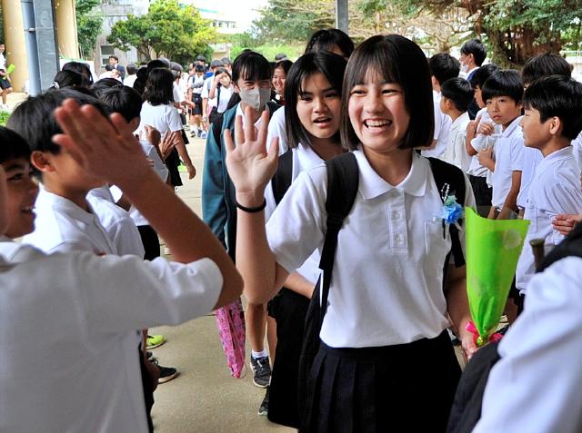 宮古島市内の小学校と多良間小学校の計10校の卒業式が19日、各校で行われた。卒業生は保護者や在校生、教職員らから温かな祝福を受けて入場。校長から卒業証書を受け取り、笑顔で新生活へ旅立った。卒業生は夢や感謝の言葉を語り、中学での飛躍を誓った。