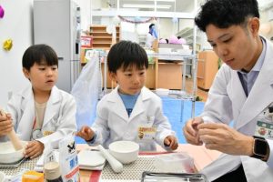 ふく薬品は20日、「こども体験薬剤師会」をふく薬品みやこ店で開催した。3~15歳の子どもたちが白衣を着て薬剤師の仕事を疑似体験。入浴剤作りや薬の袋詰めなどに挑戦した。