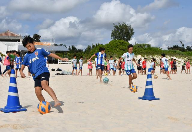 宮古出身のビーチサッカー日本代表・上里琢文選手(33)をゲストに子どもたちにビーチサッカーの楽しさを体験してもらおうと、ベストウェイ(黒田史郎社長)、ディスティーボ(野名正明代表)主催の「ビーチサッカーフェスタ2024」が22日、与那覇前浜ビーチで行われた。参加した島内外のサッカー少年ら約60人がビーチでのミニゲームなどを楽しみサッカーの新たな魅力に触れた。