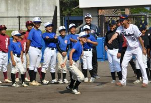 県出身で元プロ野球選手の比屋根渉さんの野球教室(主催・宮古野球連盟)が24日、伊良部球場で開催された。小学生球児23人が参加し、直接指導を受けた。比屋根さんは「走塁は試合の流れを変えることができる。勇気を持って挑戦して」と語った。