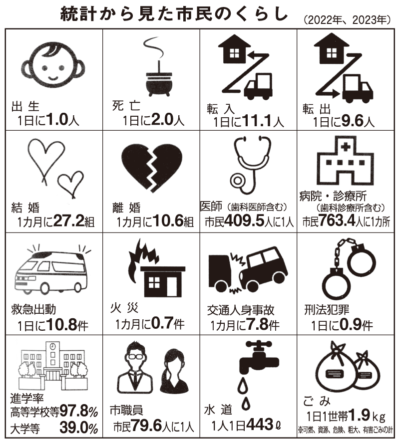 宮古島市はこのほど、市の人口や経済、教育、福祉など各分野の基礎的な統計資料を収録した「統計みやこじま」の2023年度版(第19号)を発刊した。それによると、23年12月末時点の人口は前年度同期を151人上回る5万5690人で2年連続の増加となった。出生数は死亡数を下回ったものの、転入数が転出数を上回った。統計から見ると1日に1・0人出生しているのに対し、2・0人が死亡。転入が1日11・1人に対し、転出は9・6人だった。