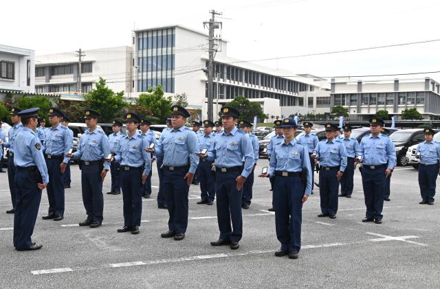 約30人の署員が同署の駐車場に集合。涼しげな青色の夏服に袖を通した署員たちは、それぞれの装備品を迅速に取り出し、警察手帳、警棒、手錠などをきちんと携帯しているかを新垣署長と武島昭副署長らからチェックを受けた。